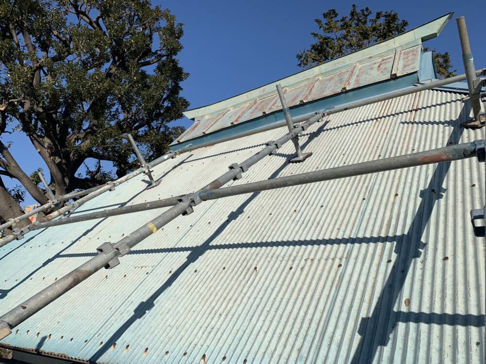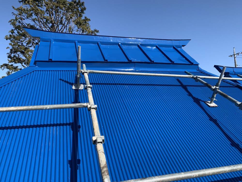 神社の関係者様が過去に壁をお手入れされていたのですが、やはり屋根の方は足場をかけないと