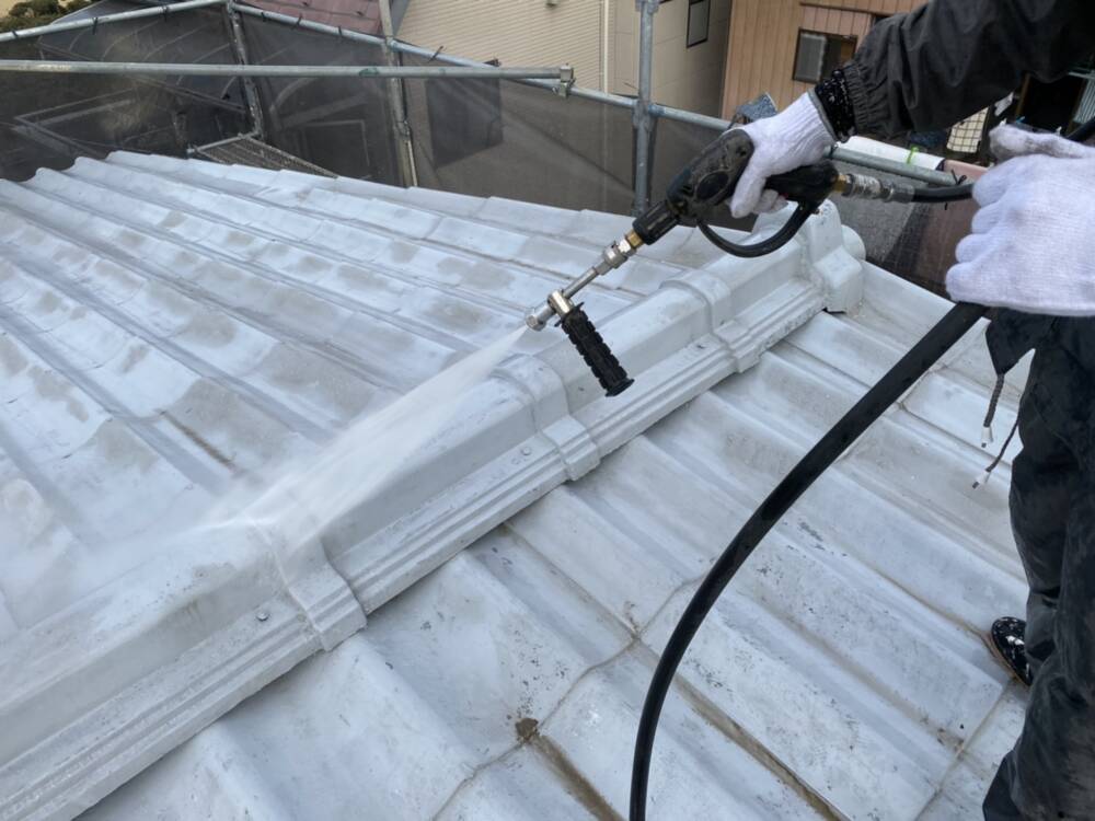 高圧洗浄により古い塗膜や汚れを落としています。