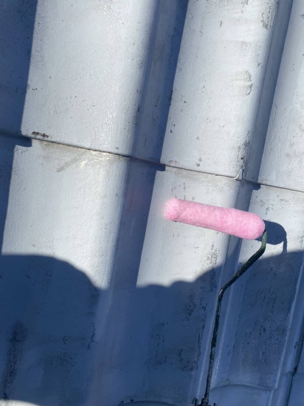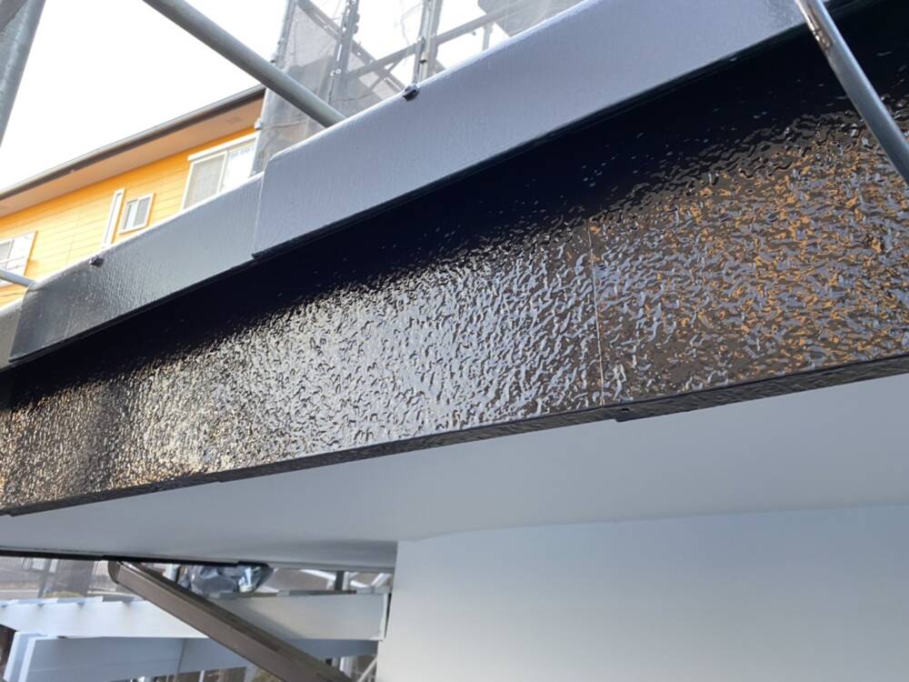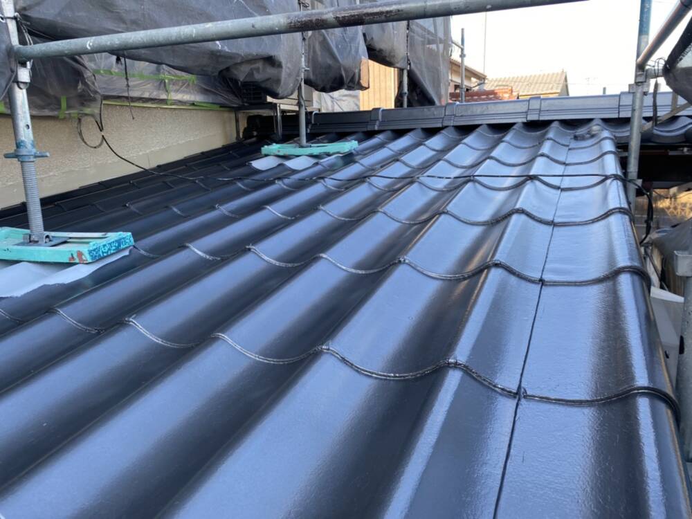 屋根の上塗り後です。 足場の下は足場解体後に塗装します。