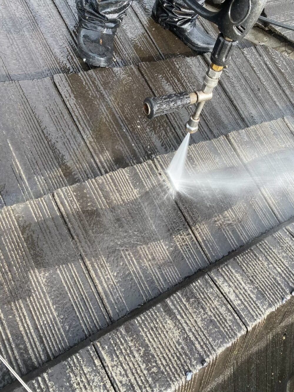 屋根の高圧洗浄をしています。モニエル瓦は洗浄が一番の肝です。