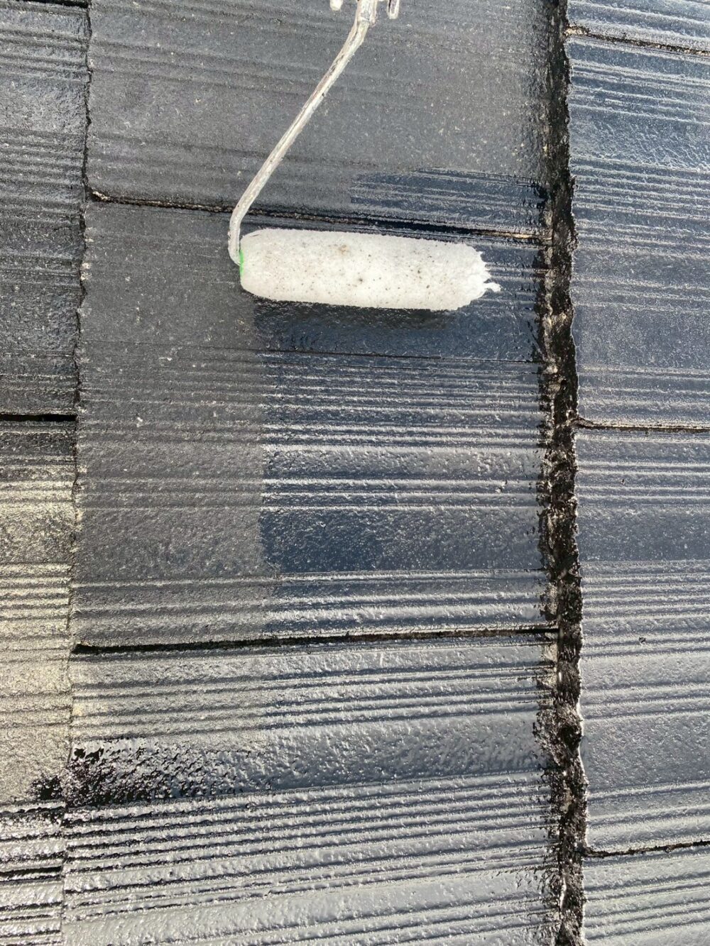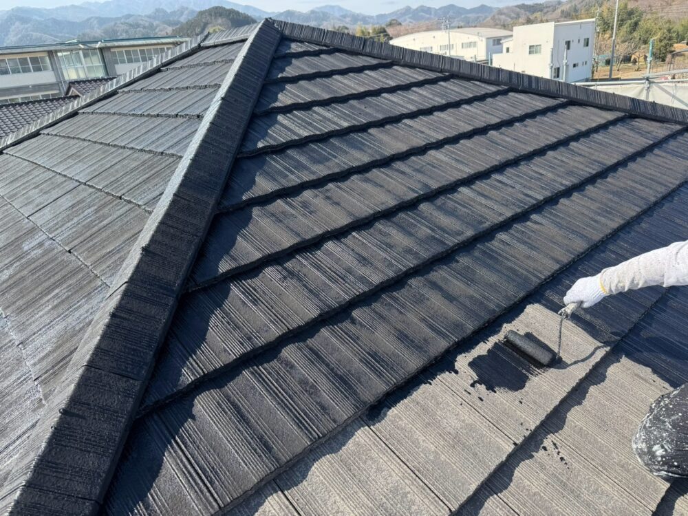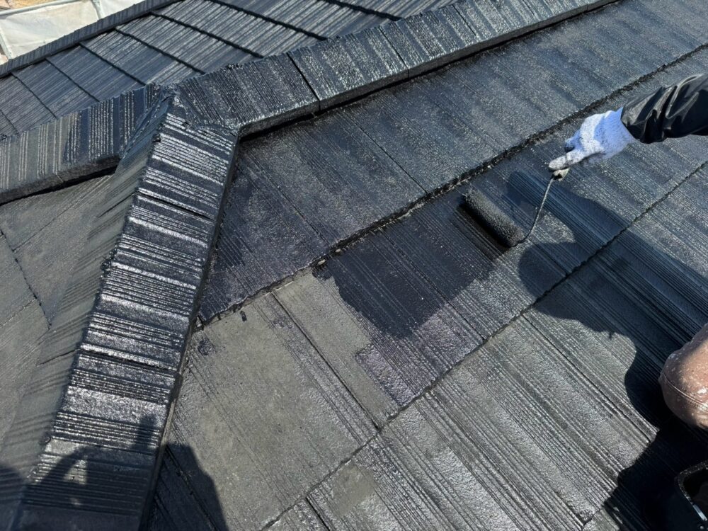 屋根の上塗りをしています。タフグロスコートを塗布することにより耐久性を大幅に向上させます。