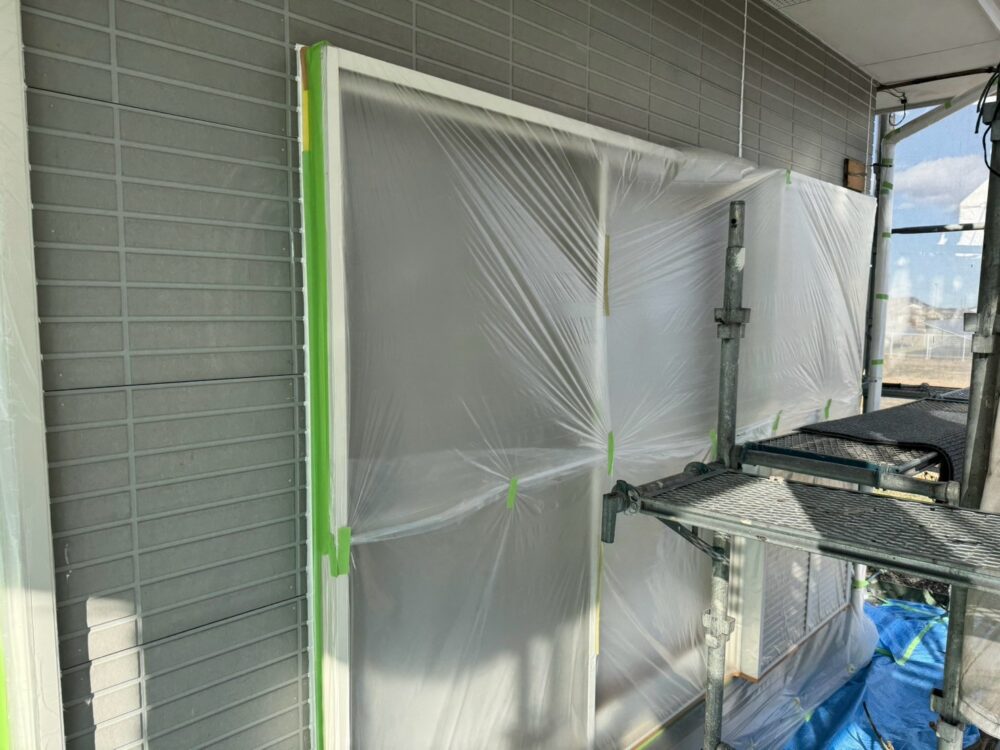 塗料が飛散しないように養生をしています。