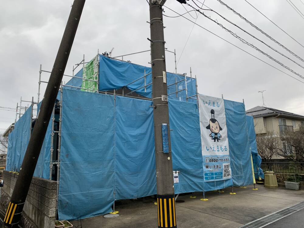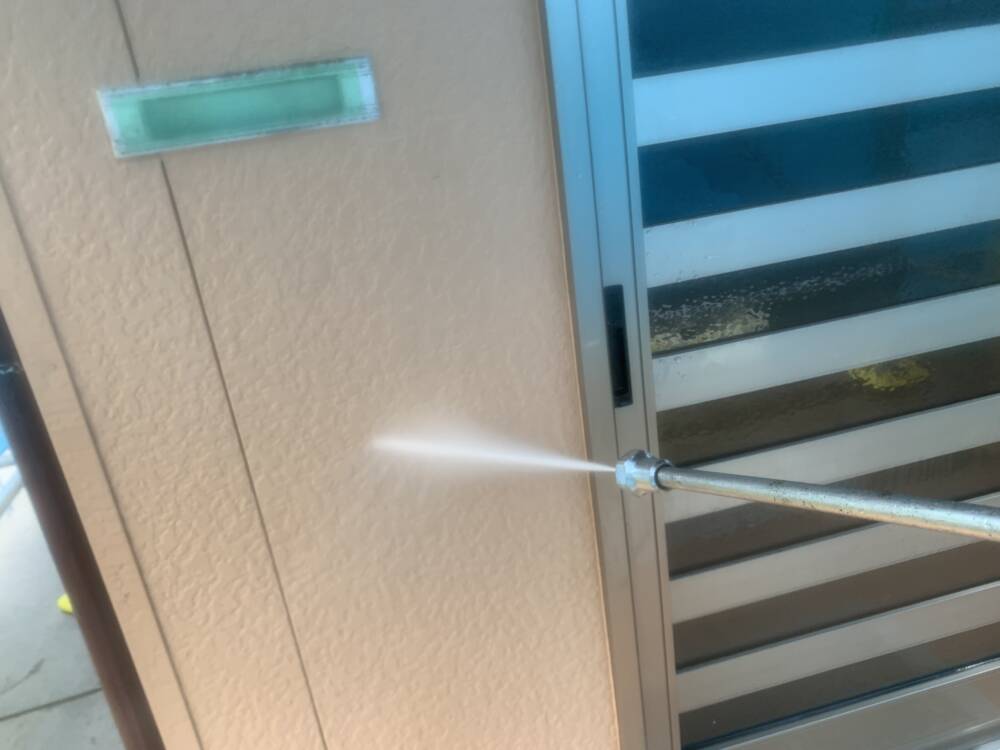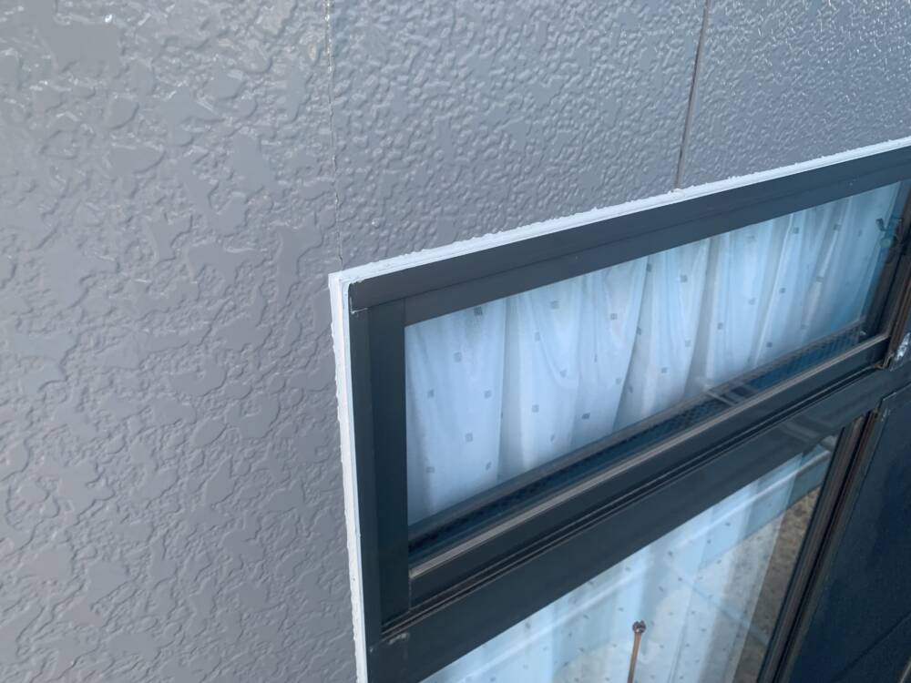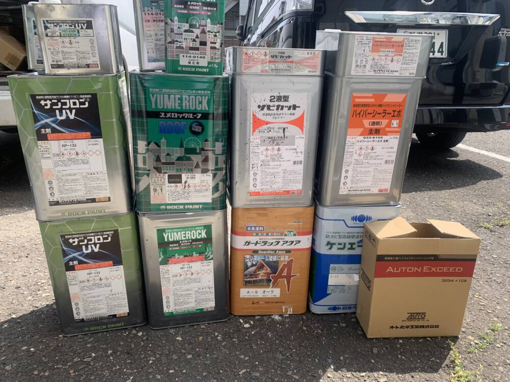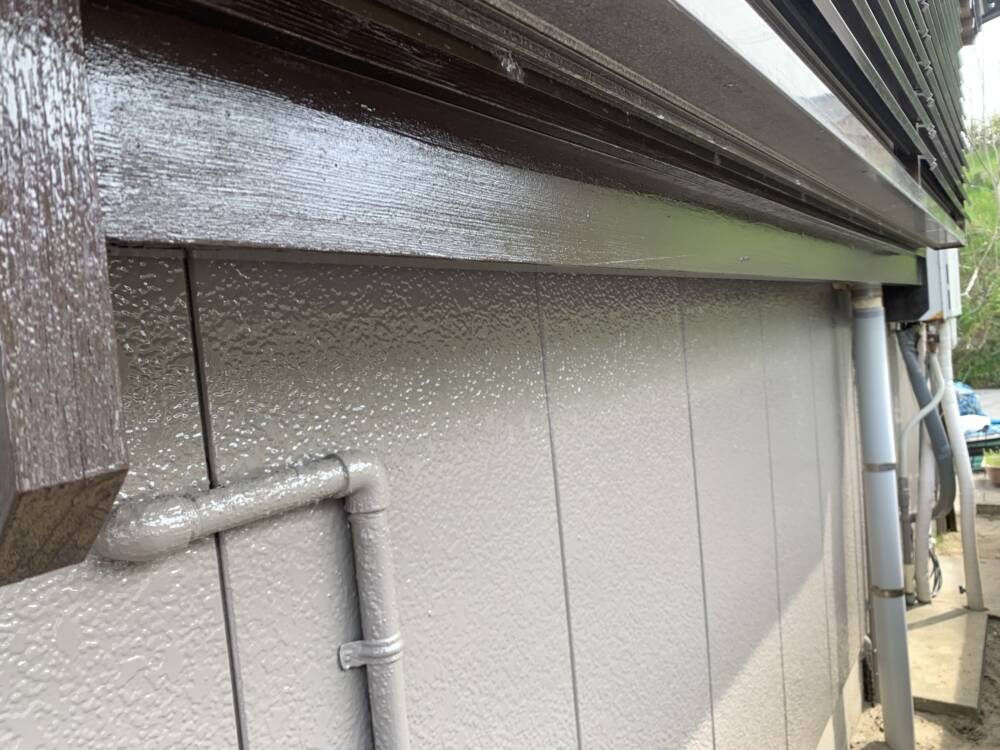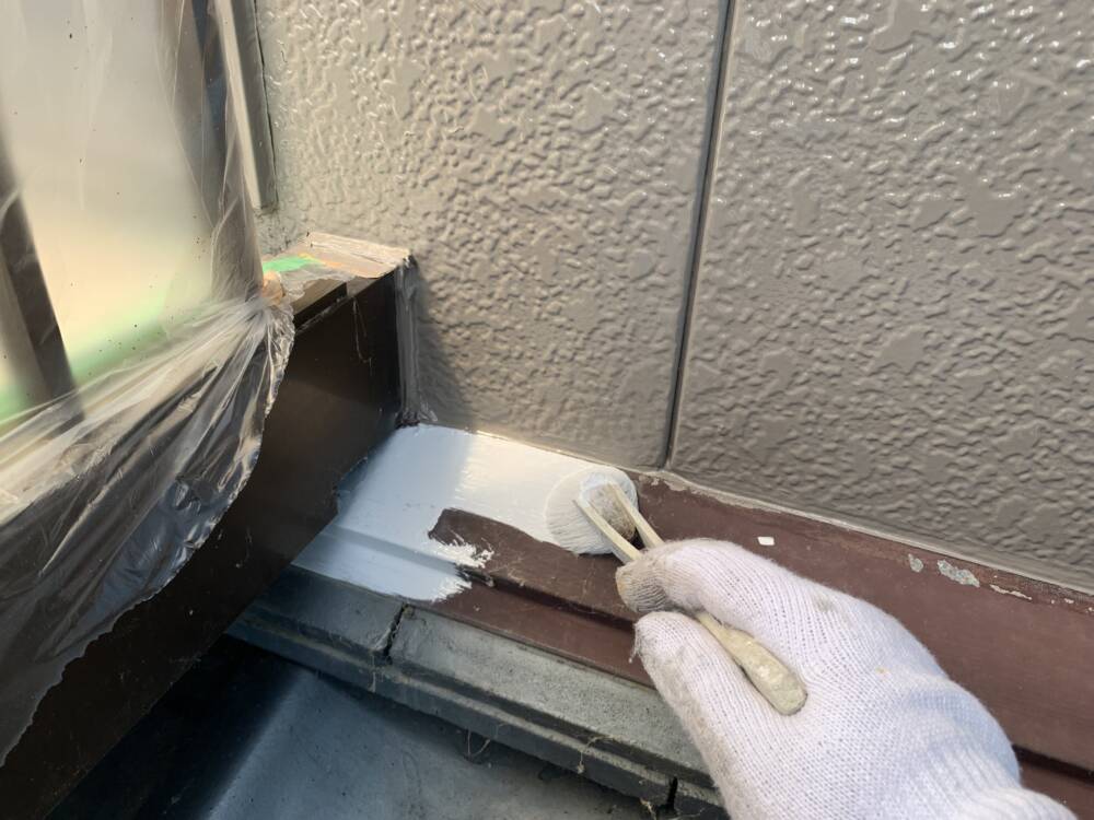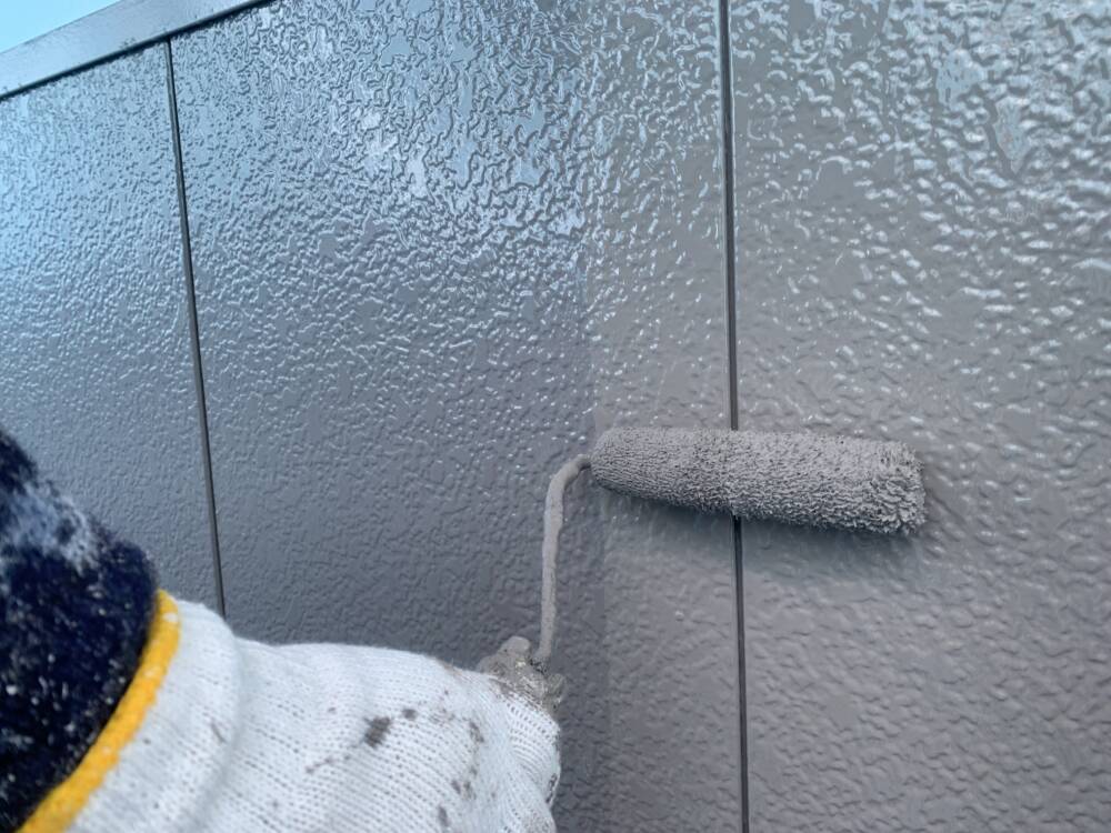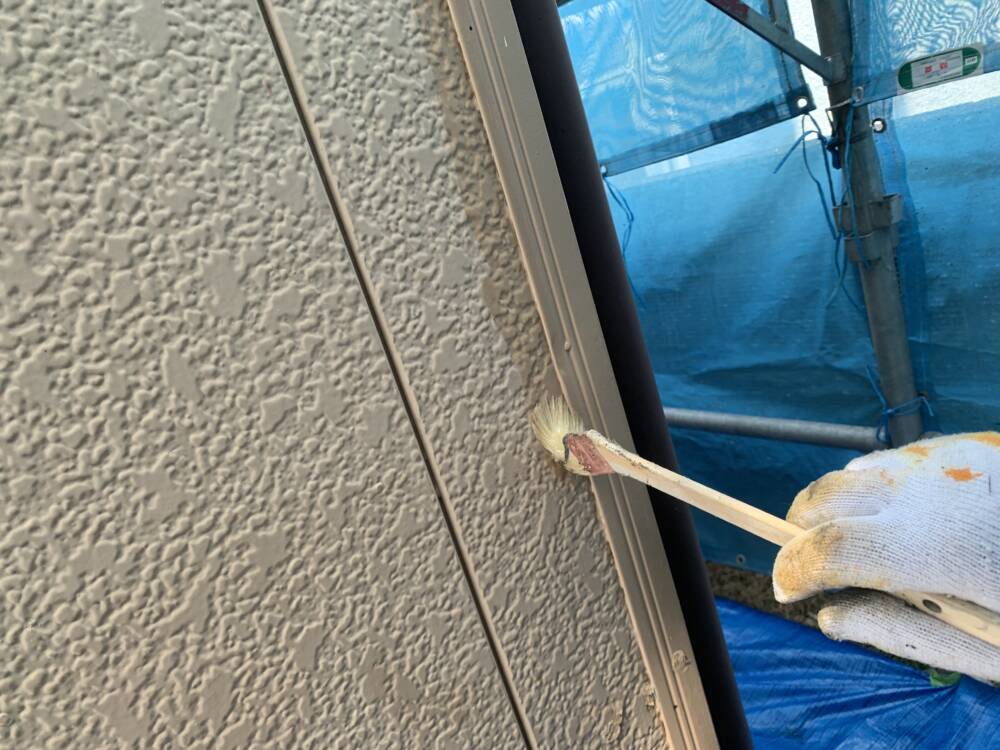 外壁の上塗り工程です。ハケやローラーで隅々まで塗っています。