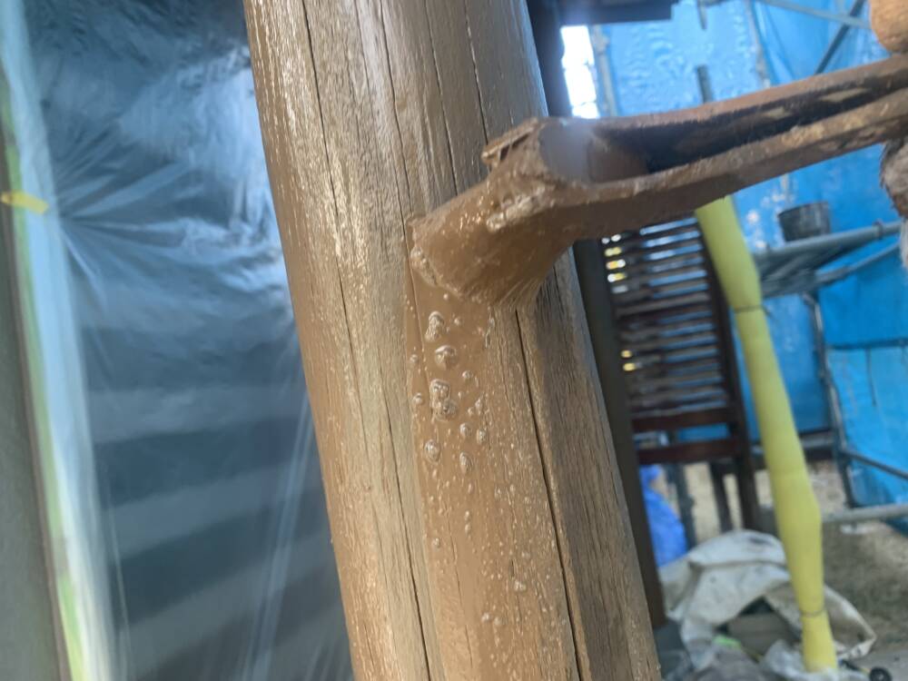 木部の塗装をしています。再塗装により防腐防虫効果も兼ね備えています。