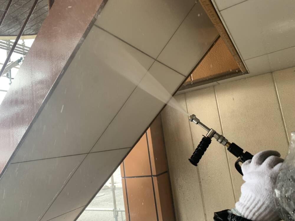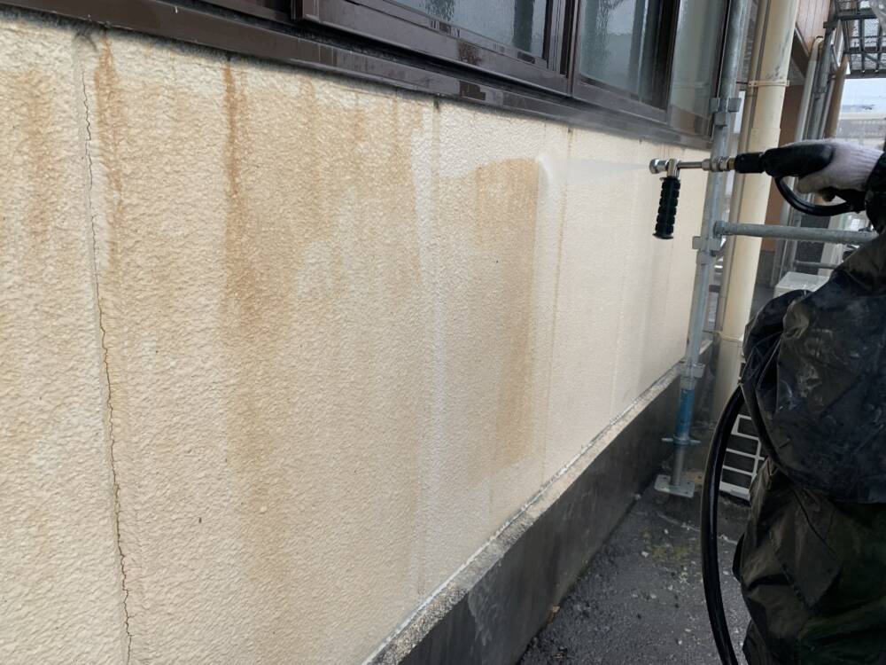 外壁高圧洗浄です。古い塗膜や汚れを落としています。