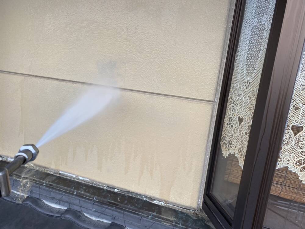 外壁高圧洗浄で古い塗膜や汚れを落としています。